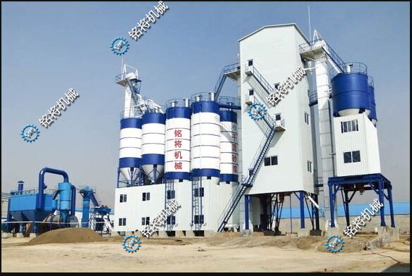 銘將生產研制的該套生產線由砂子烘干系統及預拌砂漿混合系統兩部分組成。主要包含:砂子烘干系統、篩分輸送系統、原料儲存系統、高效混合系統、自動配料系統、氣動平衡系統、除塵系統、袋式包裝系統、散裝罐車專業包裝系統以及PLC自動控制系統等。由鄭州銘將全程設計、制造并安裝調試的年產10萬噸全自動干混砂漿生產線,于2014年7月26日在浙江紹興正式投產。此后陸陸續續在江西江蘇又上了很多套此種類型的干混砂漿生產線。